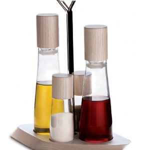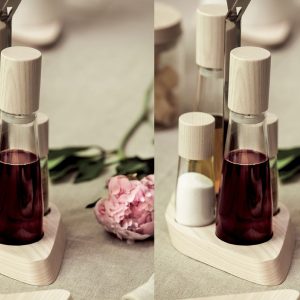 Olíu og ediksflöskur með pipar og saltstaukum á fallegum platta úr hvítbæsuðum Aski eða tóbaksbæsuðum aski. Hönnun eftir Andreas Seegatz.