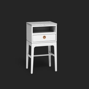 Vandað náttborð úr lakkaðri gegnheilli eik. Stálfætur. hægt að fá lakkað í örðum litum í sérpöntun. Hæglokun á skúffubrautm B.45cm