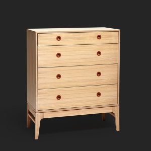 Snyrtileg og vönduð kommóða með 4 skúffum. Fæst í spónlagðri eik eða ljósgrá-lökkuð. Hægt að sérpanta með topplötu úr Ítölskum