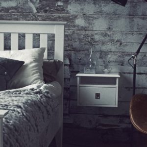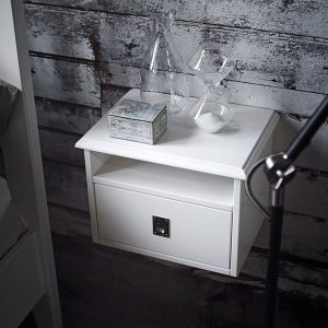 Nett og fallegt upphengjanlegt náttborð. Hvítlakkað eða koksgrátt, ein skúffa og nett hilla. Kemur samsett. Stærð B.38cm x D.28cm x