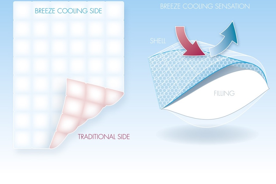 Brezze sængin er hentug m.a fyrir þá sem eru heitfengir í svefni. Hún hefur í raun tvær hliðar. Hlýju mjúku hliðina sem við öll þekkjum en svo snýrðu henni við til að fá ferska og kælandi hlið. 90% evrópskur muskvudúnn, 10% smáfiður samtals 600gr. Stærð 140x200cm eða tvíbreið 200×220. Vottanir frá m.a Nomite, Downafresh og Oeko-Tex Class 1