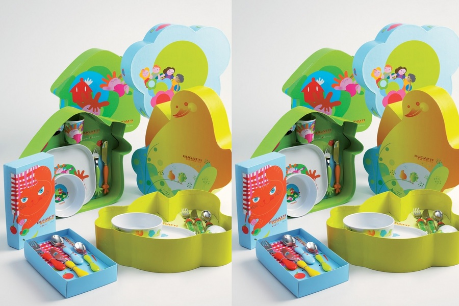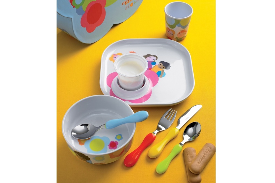 Skemmtilegt borðsett fyrir yngstu kynslóðina. Í kassanum eru 4 hnífapör, Gafall, hnífur, matskeið og teskeið ásamt súpuskál, disk og glasi. Þunnur gúmiborði er neðan á disk, skál og glasi svo þau falli síður við. Nánast óbrjótandi plast. Hönnun eftir Giuliana Corsini. Kemur í virkilega skemmtilegri gjafaöskju sem er í laginu eins og ský.