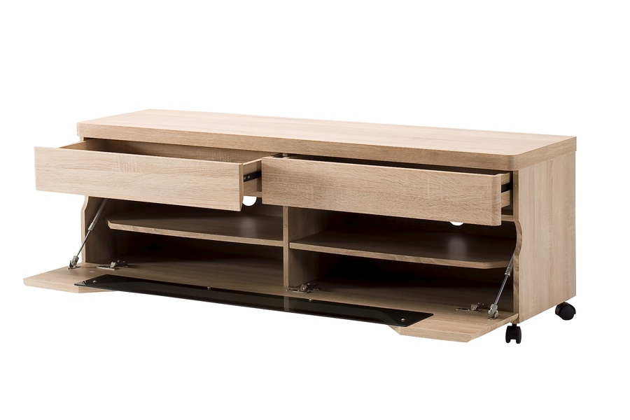 Þýskur sjónvarpsskápur, 140cm á breidd, Dýpt 39cm, Hæð 49cm. Spónlögð grófsöguð eik. Tvær góðar skúffur. Gler í framhlið, göt að aftan fyrir snúrur. Fæst einnig í háglans hvítu