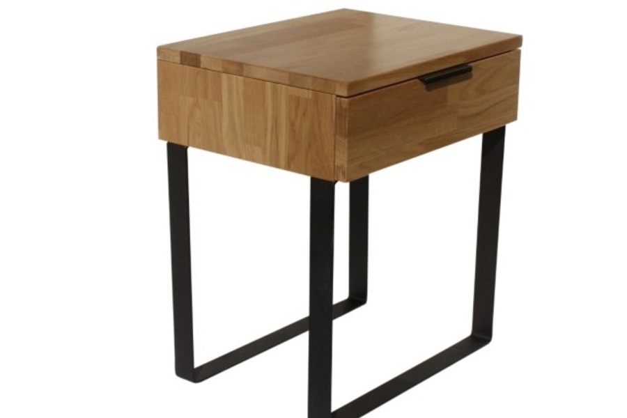 Vandað náttborð úr lakkaðri gegnheilli eik. Stálfætur. hægt að fá lakkað í örðum litum í sérpöntun. Hæglokun á skúffubrautm B.45cm D.35cm H.52cm. Kemur samsett