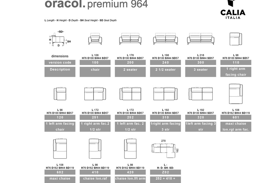 Oracol sófinn fæst í þónokkrum útfærslum sem venjulegur sófi. Kemur sem stóll breidd 108cm, sem 2.sæta 178cm 2.5.sæta 198cm eða 3.sæta 218cm. Fellanlegir höfuðpúðar fyrir aukanlegan stuðning við herðar. Oracol er hægt að panta í gríðarmörgum litum í leðri eða tauáklæði.