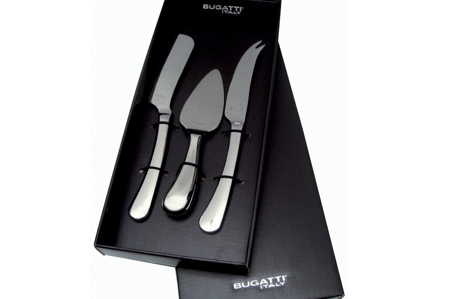 Gjafaaskja með 3 mismunandi ostahnífum úr 18/10 Ryðfríu stáli. Gorgonzola hnífur með flötu blaði, parmesan hnífur fyrir harðari osta og „deer“ hnífur með tveim oddum.