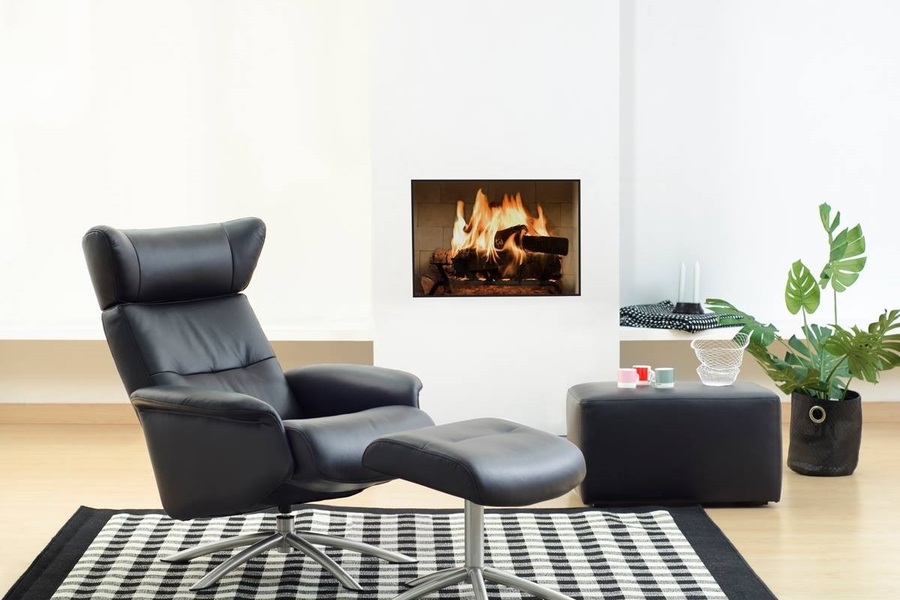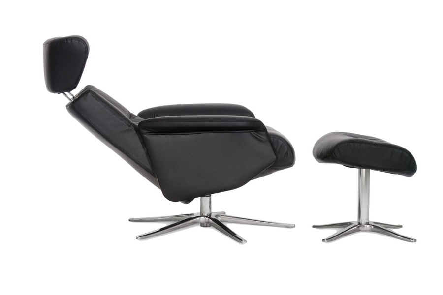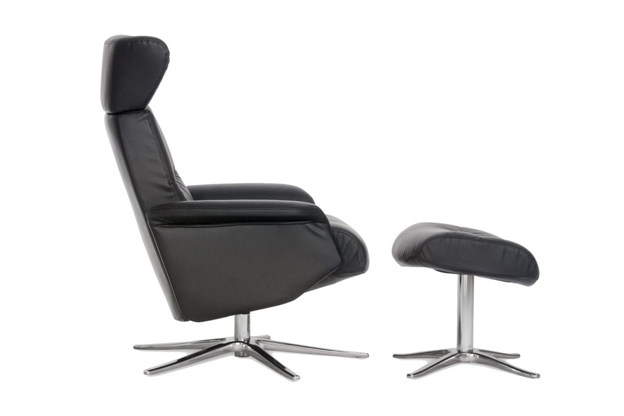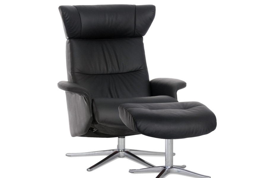 Fallegur norskur hvíldarstóll með lausu skammel. Stillanlegur höfuðpúði sem bæði er hægt að hækka og ýta fram til þess að fá sem bestan stuðning við höfuð og háls. Alklæddur þykku leðri, fáanlegur í mörgum litum og mörgum gerðum af áklæðum. Hægt að panta mismunandi snúningsplatta.