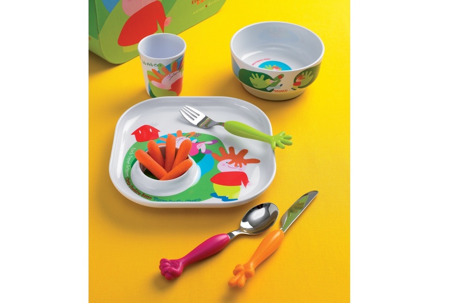 Skemmtilegt borðsett fyrir yngstu kynslóðina. í kassanum eru 3 hnífapör, skál, diskur og glas. Hönnun eftir Giuliana Corsini. Kemur í virkilega skemmtilegri gjafaöskju sem er í laginu eins og hús.