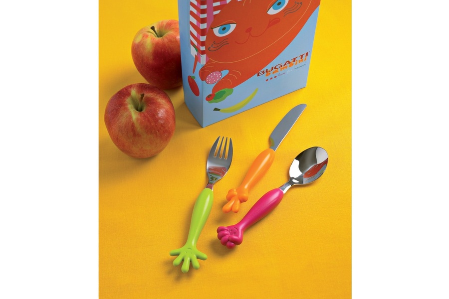 Fallegt hnífaparasett fyrir þau yngstu. Þykk og meðfærileg handföngin fara vel í litlum höndum sem eru að taka sína fyrstu bita við matarborðið. Í öskjunni er gafall, hnífur og skeið. Hönnun frá Casa Bugatti og Giuliana Corsin