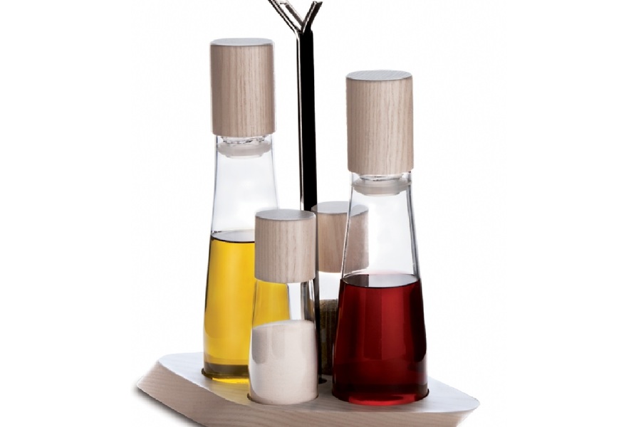 Olíu og ediksflöskur með pipar og saltstaukum á fallegum platta úr hvítbæsuðum Aski eða tóbaksbæsuðum aski. Hönnun eftir Andreas Seegatz. Raðast skemmtilega við annað úr Trattoria línu Casa Bugatti.